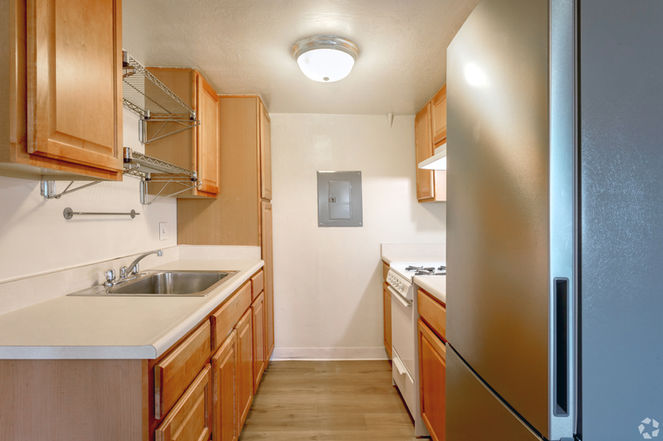We have convenient, simple galley kitchens with good cabinet space. Some apartments have upgraded cabinets, but most are old-style. Fixtures and fridges are updated. Countertops are linoleum.